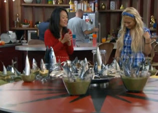 CBS finally put to use the week old food vote, and brought out mung beans and mackerel for Have Notties, Aaryn, GM, Jessie and Elissa. Apparently Andy got to "pick" the HNs, though they're all saying it was all volunteer. Everyone's had a turn now. Helen even gave Aaryn slop cooking lessons, and advice on cold shower tactics.