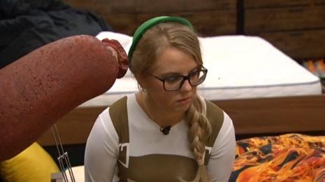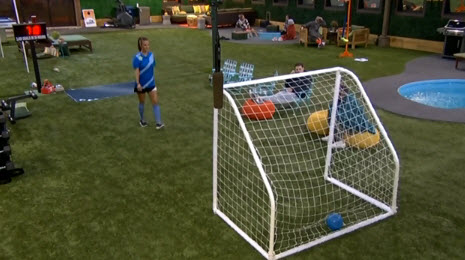 The remaining comp consequences were "penalty kicks" for Cody--every time an alarm sounds he has to go to the backyard and use a mechanical foot to kick himself in the butt 10 times--and 2,400 goals in 24 hours for Brittany. If Brit doesn't make her goals she can't play in the next POV (and I think she also said something about can't be saved by the BOB). This is a really difficult position for Brit to be in. If she achieves the goal, she's labeled a huge threat and so she has to go. If she gives up and doesn't try she's called a quitter and doesn't want to be there. Best case is she tries and doesn't quite make it. Then she's not a quitter, but can argue, hey, keep me around, I can't play next week.
